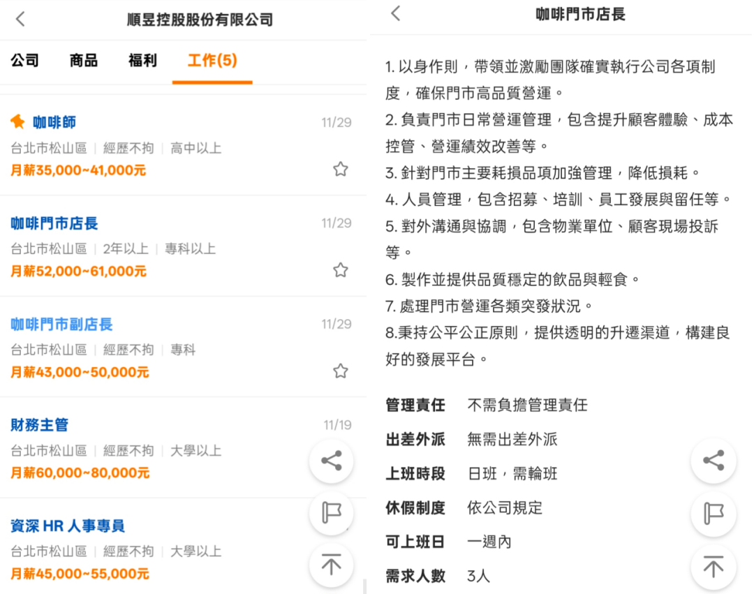 目前,该网传选址门店已张贴瑞幸经典蓝白色调的招聘海报,海报附带的二维码指向代理公司顺昱控股在台湾招聘网站的官方招募页面。公开招聘信息显示,顺昱控股正为台湾市场招募咖啡师、店长、副店长、财务主管及资深HR人事专员等核心岗位。