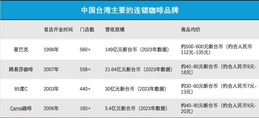 除了占据主导地位的便利店咖啡品牌,中国台湾咖啡市场还盘踞着四大连锁品牌阵营,分别是:星巴克、路易莎咖啡、85度C与cama咖啡,各自凭借差异化优势占据细分市场。