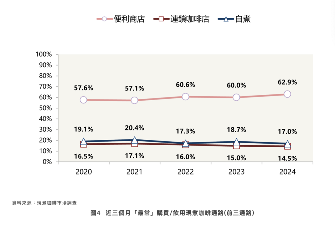 数据显示,2024年,97.2%的消费者过去三个月曾在便利店(如统一超商的CITY CAFE、全家的Let's Café等)购买现煮咖啡;消费者最常购买/饮用的渠道也是以便利商店为首,占比达到62.9%。