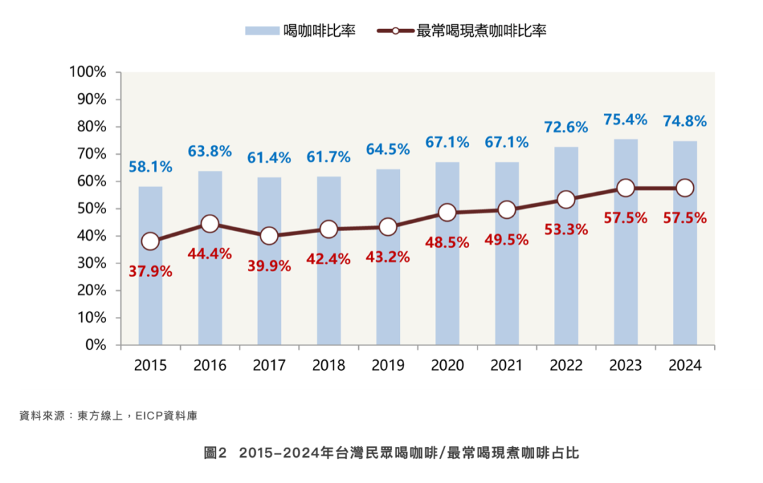 同时,2024年中国台湾13-64岁的消费者中,喝咖啡比率达到74.8%;最常喝“现煮咖啡”的比例也占到总人口的57.5%。显然,咖啡已经变成了当地消费者最日常的饮品之一,并渗透进年轻学生、白领及中老年人等各年龄段人群的日常生活中。