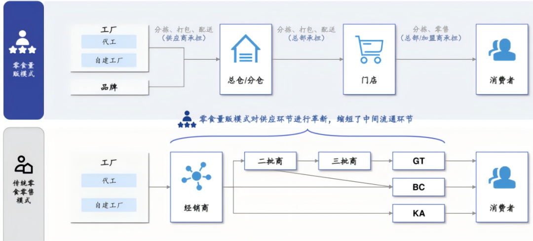 量贩模式是专卖店渠道中一种创新的商业模式,专注于提供精选多品牌、多品类的产品组合,为消费者提供了更具成本效益、更便捷的购物体验,成为休闲食品饮料零售行业扩张的重要力量。量贩零食店精准抓住了传统超市渠道的上述痛点,进行了一场针对性的渠道革命,对“价—品—场”进行了全面重构。