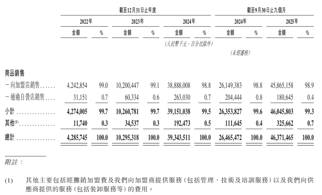 以龙头企业鸣鸣很忙集团为例,2024年集团营业收入393.44亿元,其中商品销售收入391.51亿元(占比99.5%),加盟费及服务费仅1.92亿元(占比0.5%)。其毛利率从2022年的7.5%稳步提升至2025年前三季度的9.7%,经调整净利率从1.9%提高至3.9%,盈利能力与盈利质量同步提升。