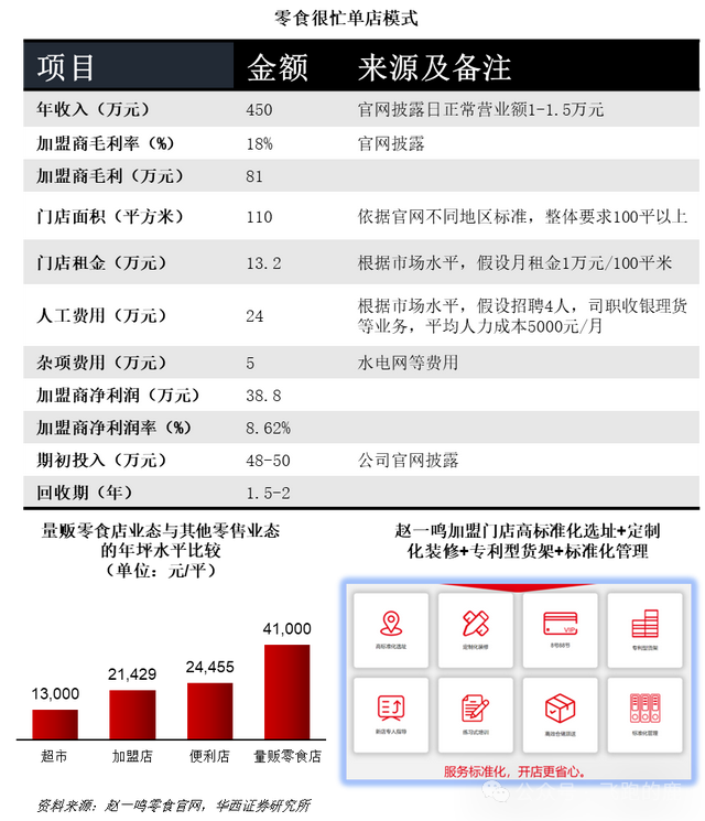 商业模式的创新与痛点的解决,只是量贩零食店发展的前提和基础。让加盟商能够赚到钱,才使得这一商业模式具备了快速复制的可能,也吸引了全社会投资人和资金参与到这场渠道革命中,这一切都要从其单店模型说起。