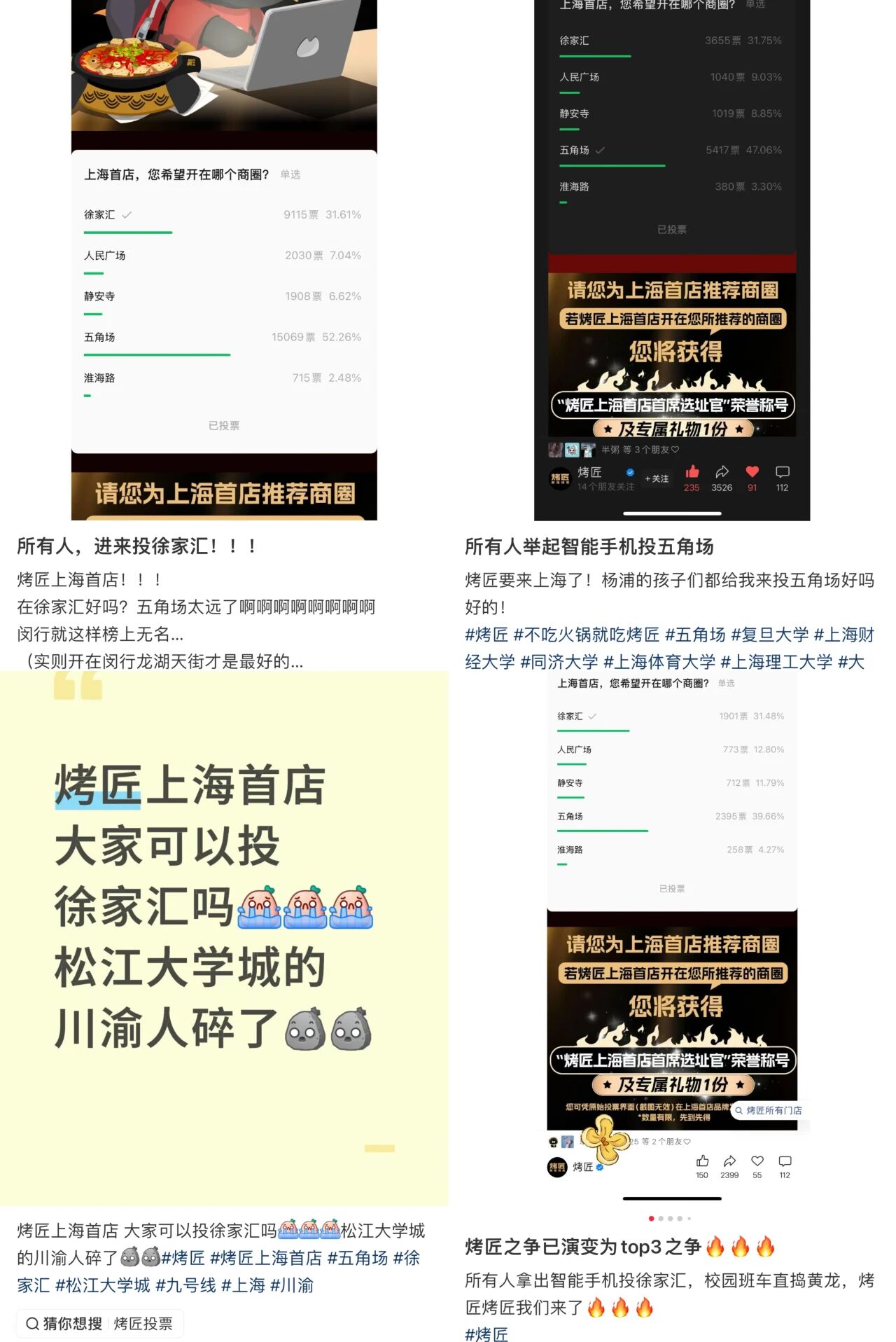 赢商网注意到,自烤匠官宣以来,社交平台上关于上海首店的讨论热度极高,其中对五角场、人民广场、静安寺、淮海路、徐家汇等区域的呼声尤为集中。